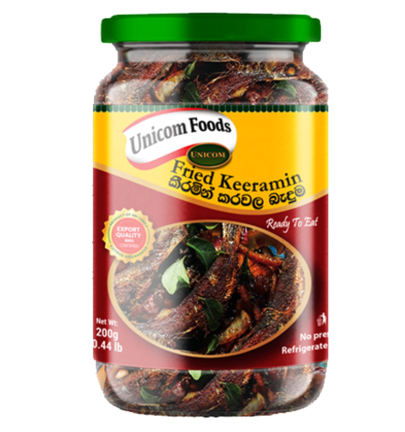 DRIED KEERAMIN FISH , B OINION , CHILI , SUGAR VEGETABLE OIL , TAMARIND , RAMPE , CURRY LEAVES
